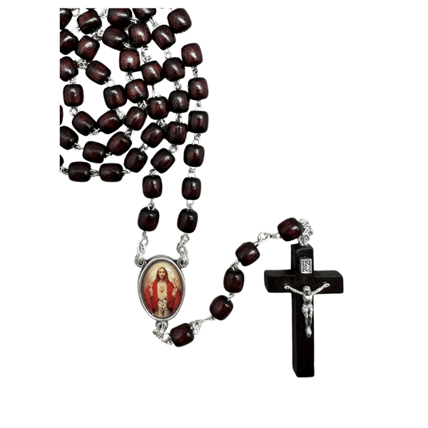 ROSARY WOOD CYLINDER BEAD SACRED HEART JESUS MEDAL